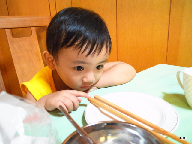 用菜期間,阿鼓調皮的跑下桌,在隔間裡晃來晃去~ 一直偷看包廂裡用餐的其他客人!