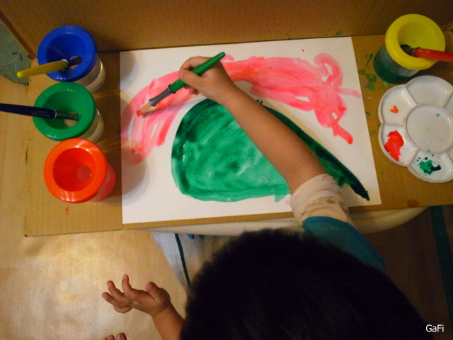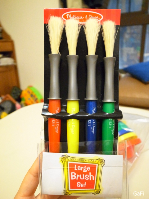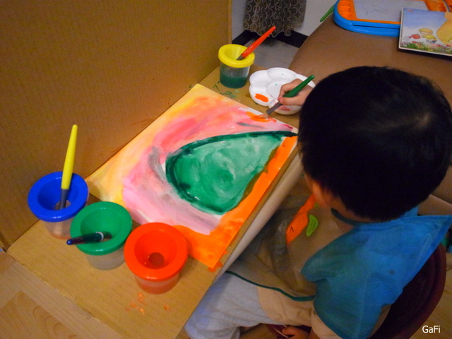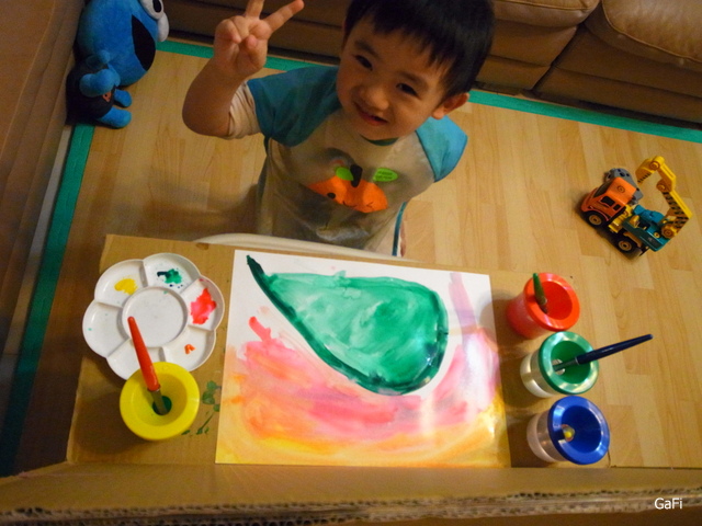 另外,因為媽咪我買的洗筆桶和兒童用水彩筆到貨! 所以決定讓小阿鼓用水彩創作~