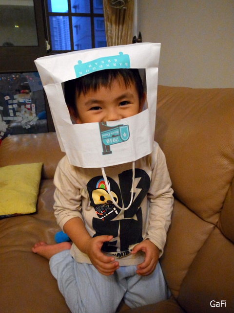 媽媽我隨手拿了一個紙袋,中間剪了個四方形的洞,就給小子戴上囉! 可愛的小戰將!!
