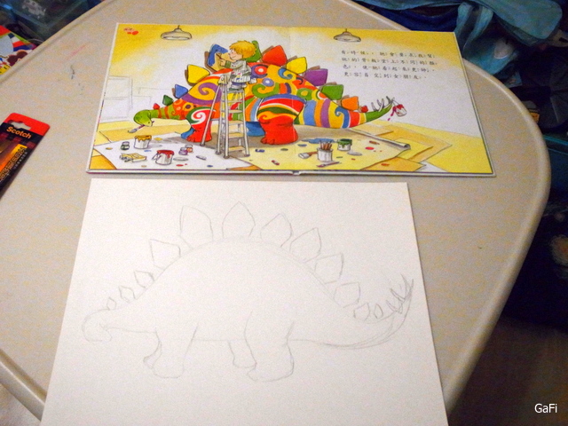 翻了又翻~啊!就是這一頁了! 媽媽我轉身向小阿鼓說: 我們來畫一幅"我的恐龍朋友-劍龍吧!"