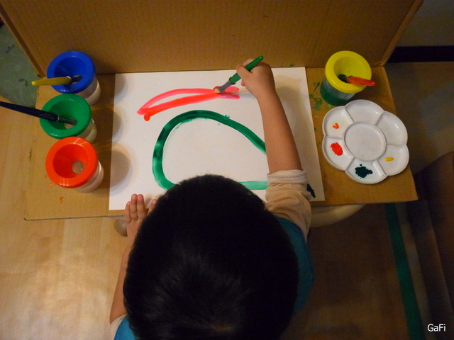 我們自己做的廢紙箱兒童畫板又派上用場囉!