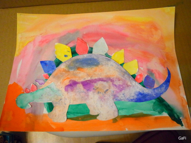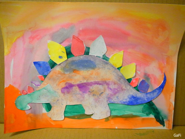 等劍龍身體、骨板和背景都陰乾之後,用白膠黏貼在背景上,就完成囉!