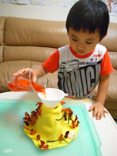 接下來~貓兒準備了一小杯溫水,加入紅色食用色素混合後,讓小阿鼓倒入火山杯中~