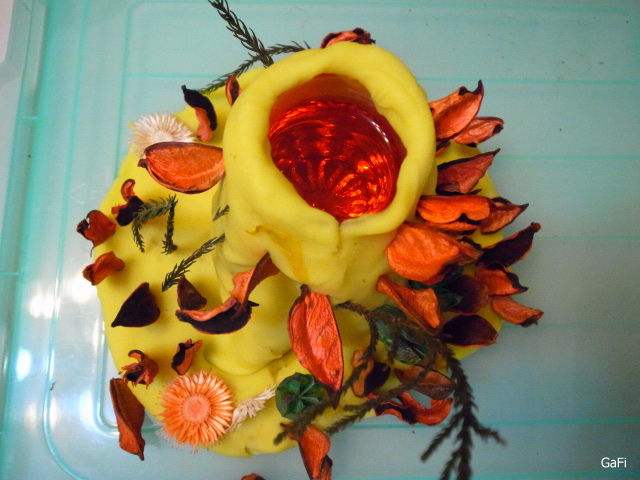 這次搭配黃色黏土火山,貓兒我準備了橘色系的乾燥花讓小阿鼓隨興裝飾~