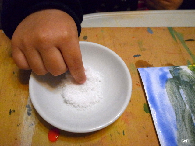接下來~ 為了實驗水彩+鹽巴的效果,母子兩將顏料用水稀釋~